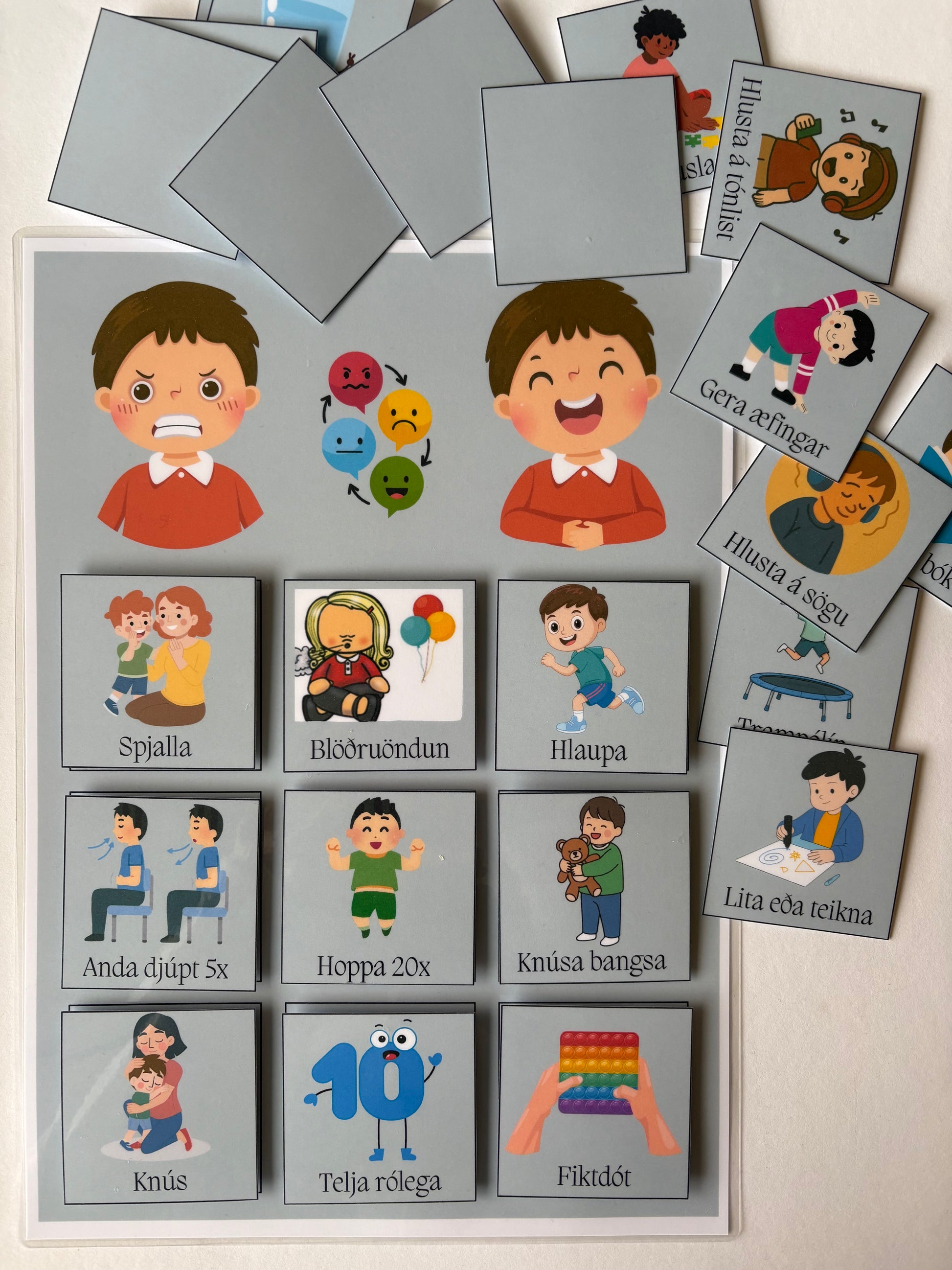 Það er að sjálfsögðu í lagi að verða reiður en það er óþægilegt að vera reiður til lengdar og sum börn eiga mjög erfitt með að takast á við reiðina sína og nota óæskilegar aðferðir svo sem að meiða, særa og þess háttar. Með spjaldinu kennum við þeim að velja æskileg bjargráð við reiði sem mun nýtast þeim áfram fram á fullorðinsár. Góðar leiðbeiningar um notkun fylgja spjaldinu.
